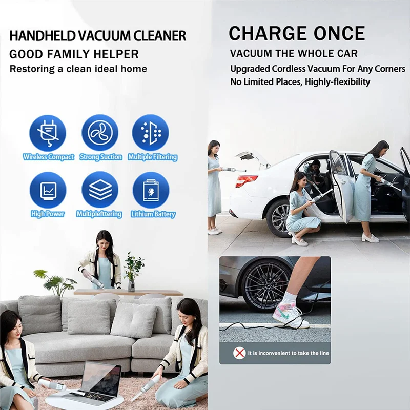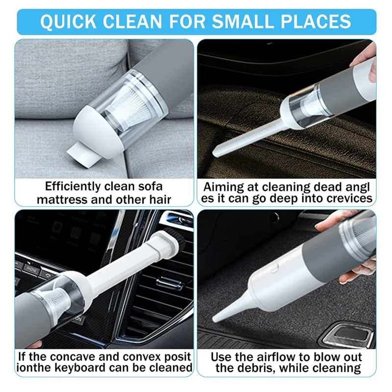 [Powerful suction, long-lasting battery life] The small vacuum cleaner provides strong cleaning power at high speed, which can quickly and deeply clean almost all hard-to-reach small spaces, such as the interior of the car, sofa, carpet, furniture, and even keyboards!